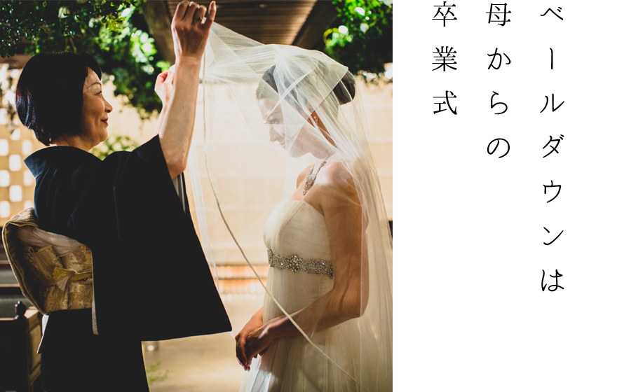 ベールを纏った花嫁を目の前に、お母様から想いをこめたベールダウンの時間をご用意しております。ベールを落とした瞬間に、お母様は娘からの子離れを決意し、一人の女性として認め、おくりだすことになります。これからは花婿の沢山の愛情で彩られることを願いながら、最愛の気持ちをこめて行われるたった数秒の儀式、だけど本当は“特別な時間”。お母様の子育て終了記念日。“特別な「ありがとう」”をお伝えください。
