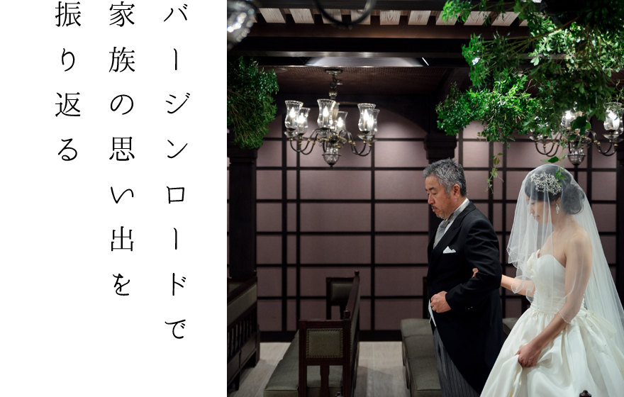 バージンロードを大切な家族と歩くとき<右足を出して揃える、左足を出して揃える>、このウェディングステップ は、赤ちゃんのときのおぼつかないヨチヨチ歩きを表しています。年月を重ね家族の愛に包まれて育った花嫁は花婿のもとへ。花婿はお父様と花嫁が歩んでくる姿を胸に刻み、目に焼き付け、一生守ることを心に、誓います。