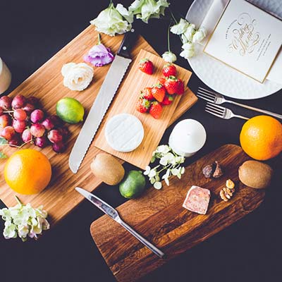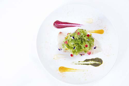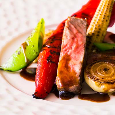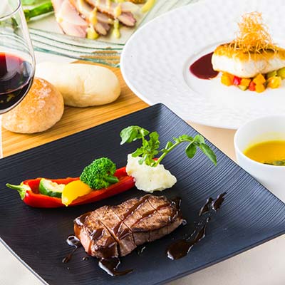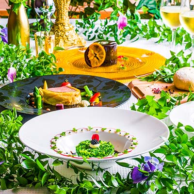 地元の新鮮な食材や旬の逸品をつかい、和テイストのフランス料理をご用意しました。素敵な器に盛りつけられたお料理は、味だけでなく見た目もお楽しみいただけます。また幅広いゲストにご満足いただけるようすべてのメニューを、お箸でお召し上がれるようにいたしました。