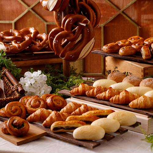 フルコースをひきたてる、こだわりのパンでは『パンビュッフェ』という演出をお楽しみいただけます。焼き立ての自家製パンで、美味しいひとときを。